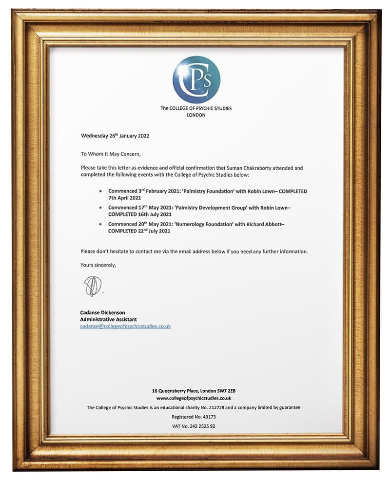 I have had the privilege of studying at the renowned College of Psychic Studies (CPS) in London, UK, where I learned from the best minds in the industry and earned a professional diploma.